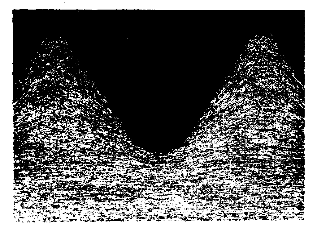 Conventional taps remove material by the cutting action of the tap. However, cold-forming taps have a wedging tooth profile that displaces material rather than removing material. This plastic cold working induces compressive stresses at the thread root while maintaining grain flow and also can leave a radius at the thread root (figure 4b). (Note, however, that the compressive stresses are removed if the part is heat treated after tapping.) Additionally, the thread surface is smooth and burnished (Destefani (1)).
