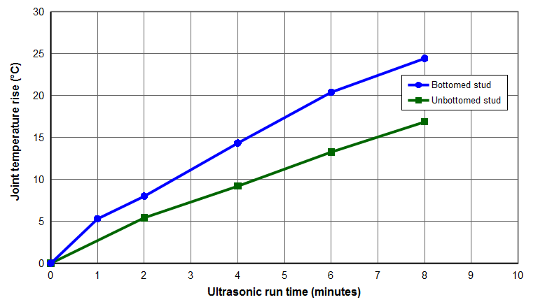 Branson uses studs with knurled ends that are bottomed, together with Loctite® 290 (where appropriate). A company that makes ultrasonic metal welders uses unbottomed studs with Loctite® 243 (Culp (0)). Table 3 shows a comparison of these Loctite® grades.